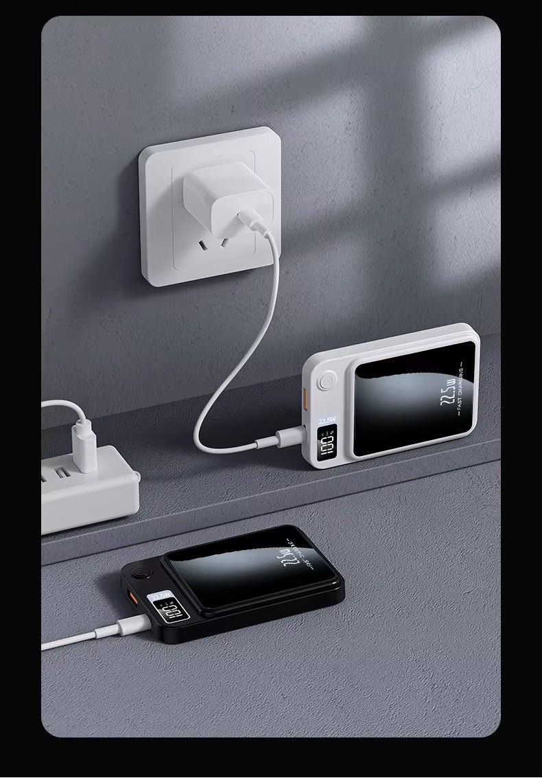 Unterstützt 22,5 W schnelles Laden/unterstützt 15 W kabelloses Qi-Laden/unterstützt magnetisches kabelloses Qi-Laden/unterstützt Typ-C-Eingang und -Ausgang/unterstützt USB-Ausgang/mit Magnetring, geeignet für kabellose Smartphones.